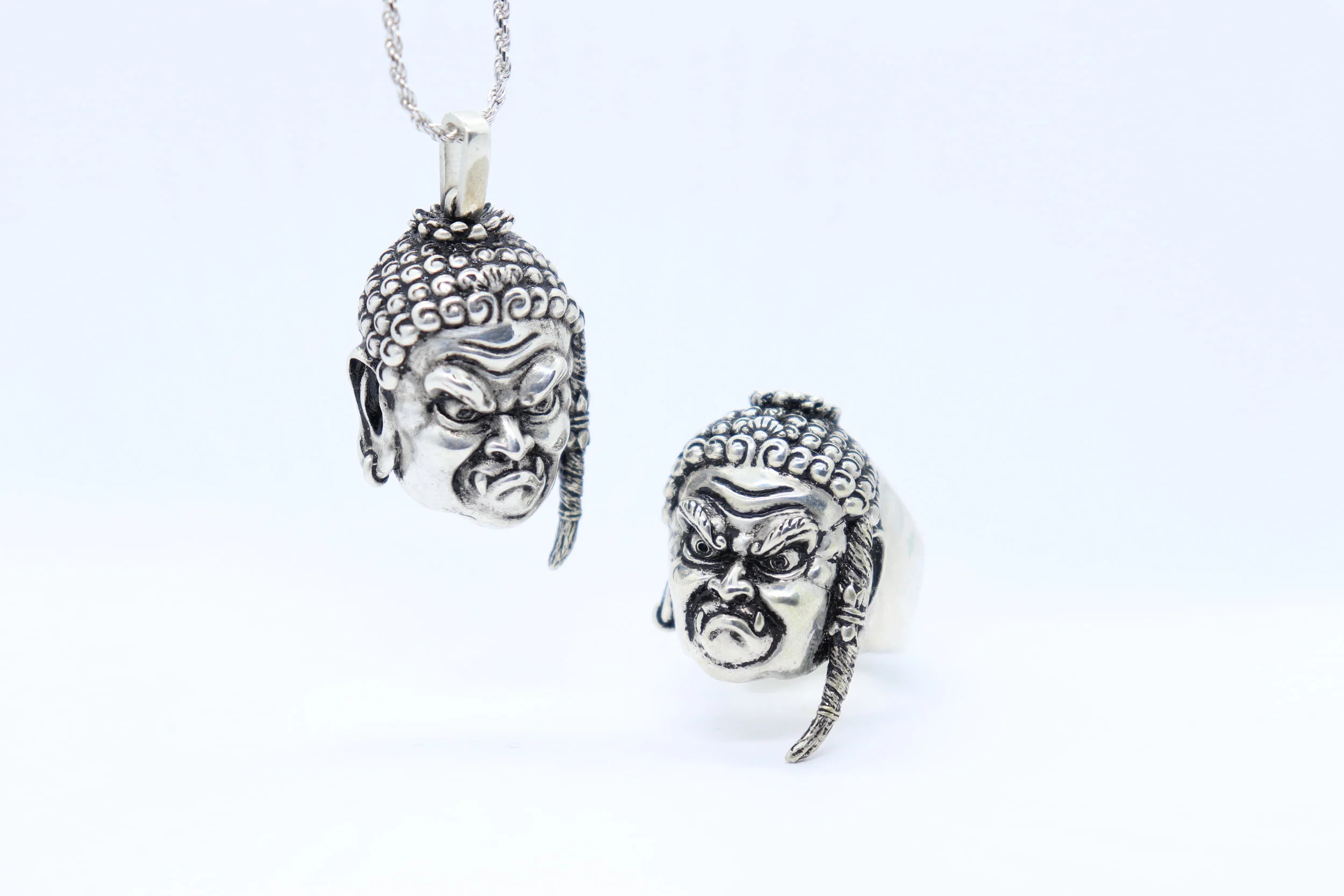 Fudo Myoo represents absolute determination. He has a furious and menacing face, the teeth bite the upper lip, shown by two fangs, one pointing upward (desire for progression), other pointing down representing (eternal compassion). Ultimately representing the luminescent of Buddha.