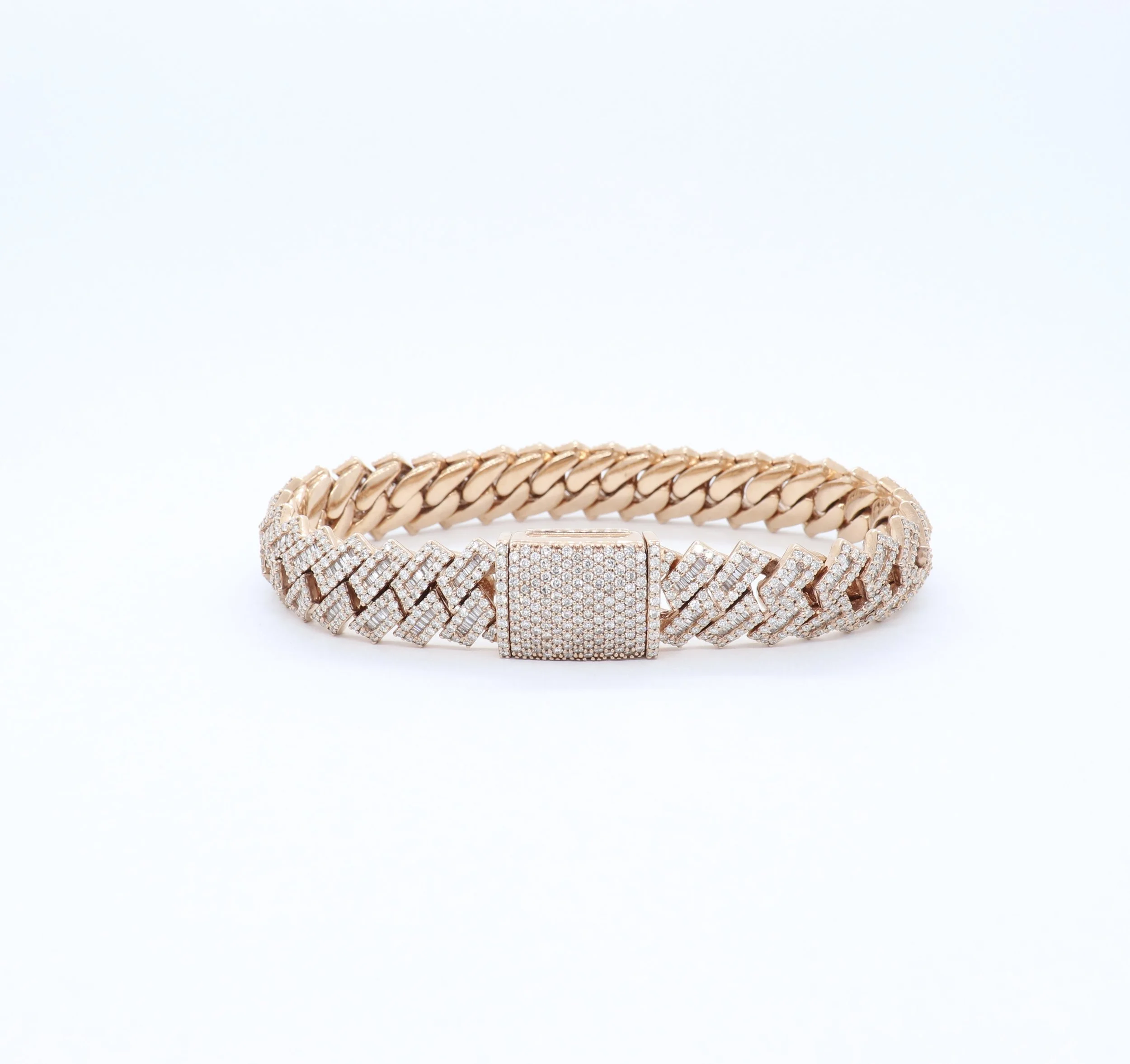 13mm 10k solid rose gold cuban link bracelet with baguette and round diamonds